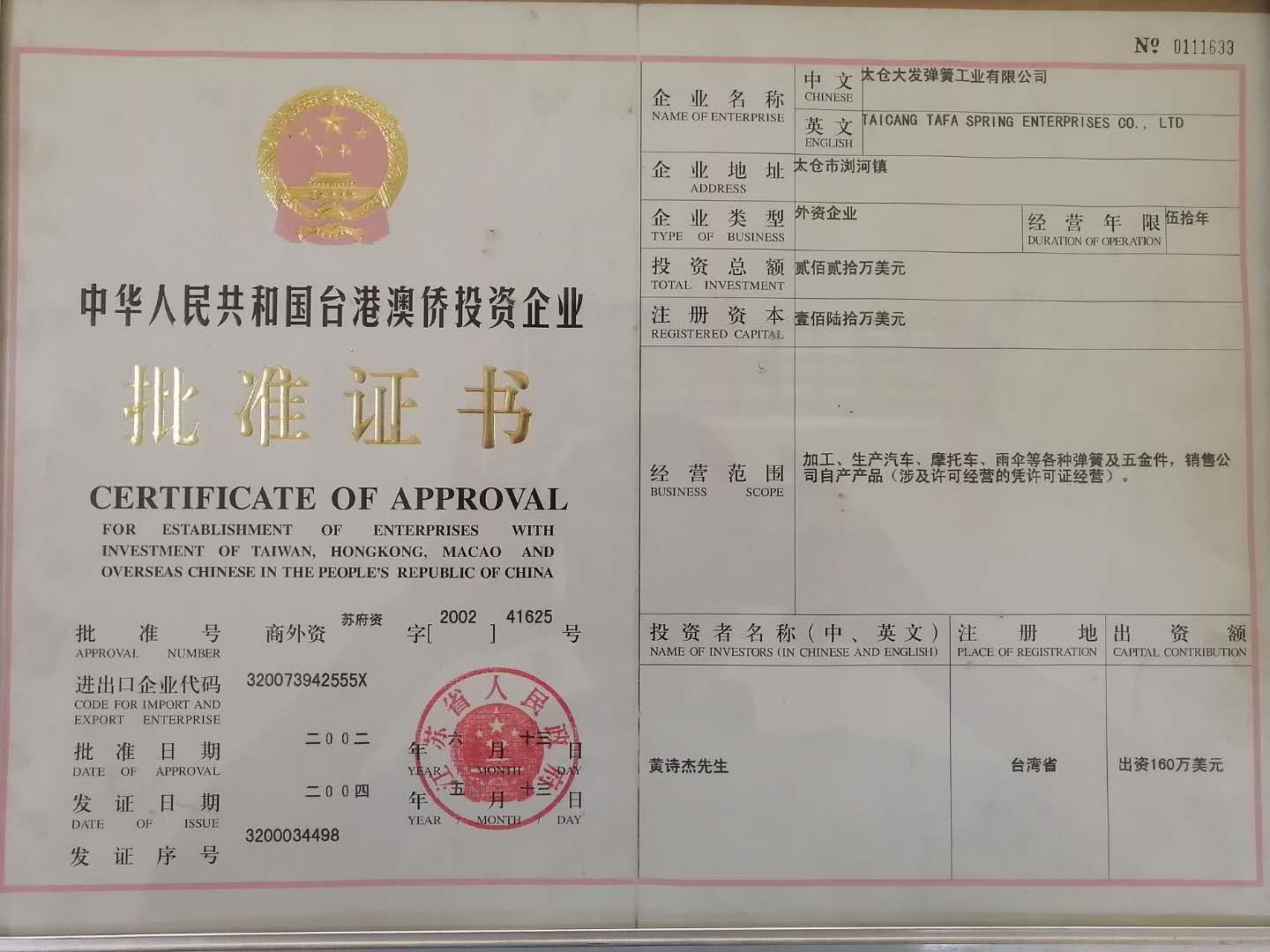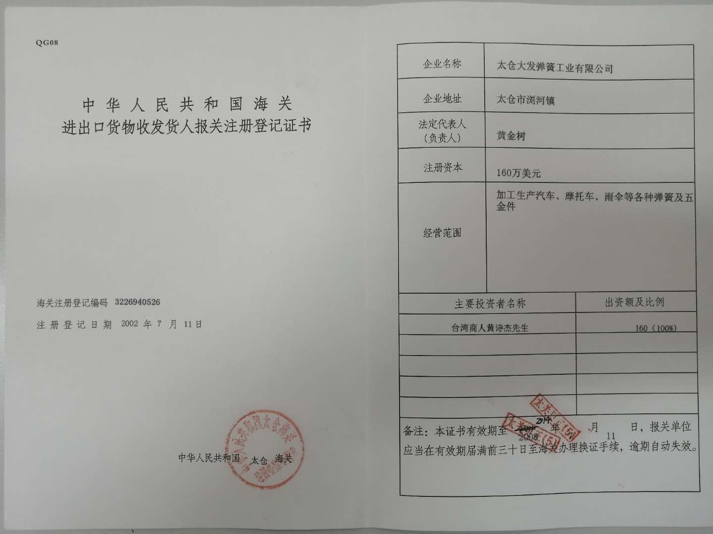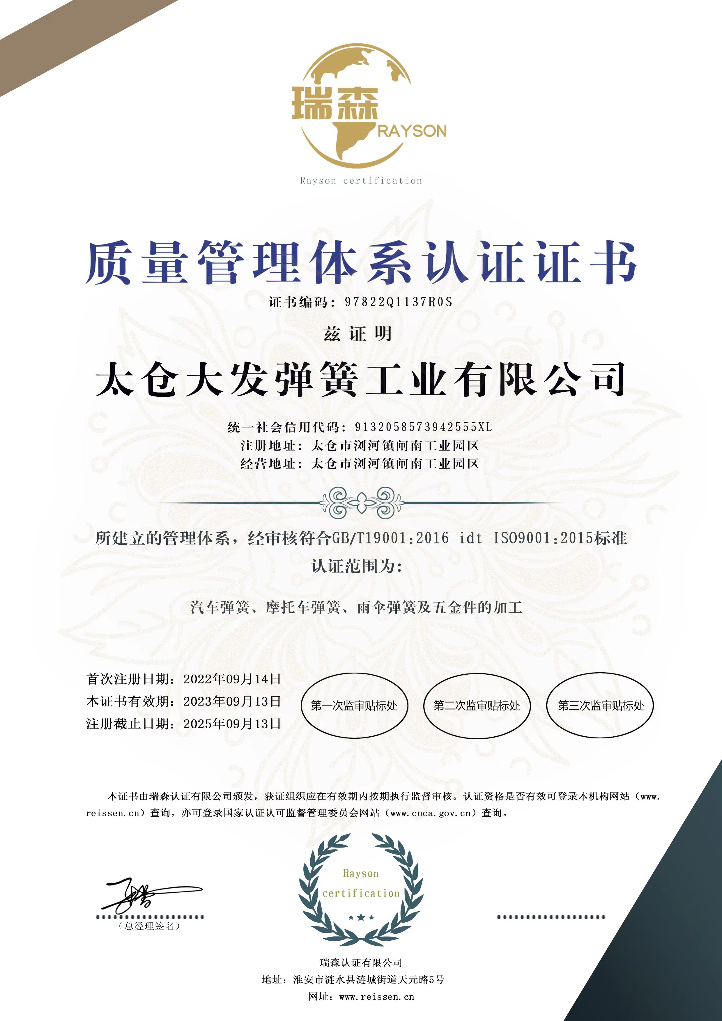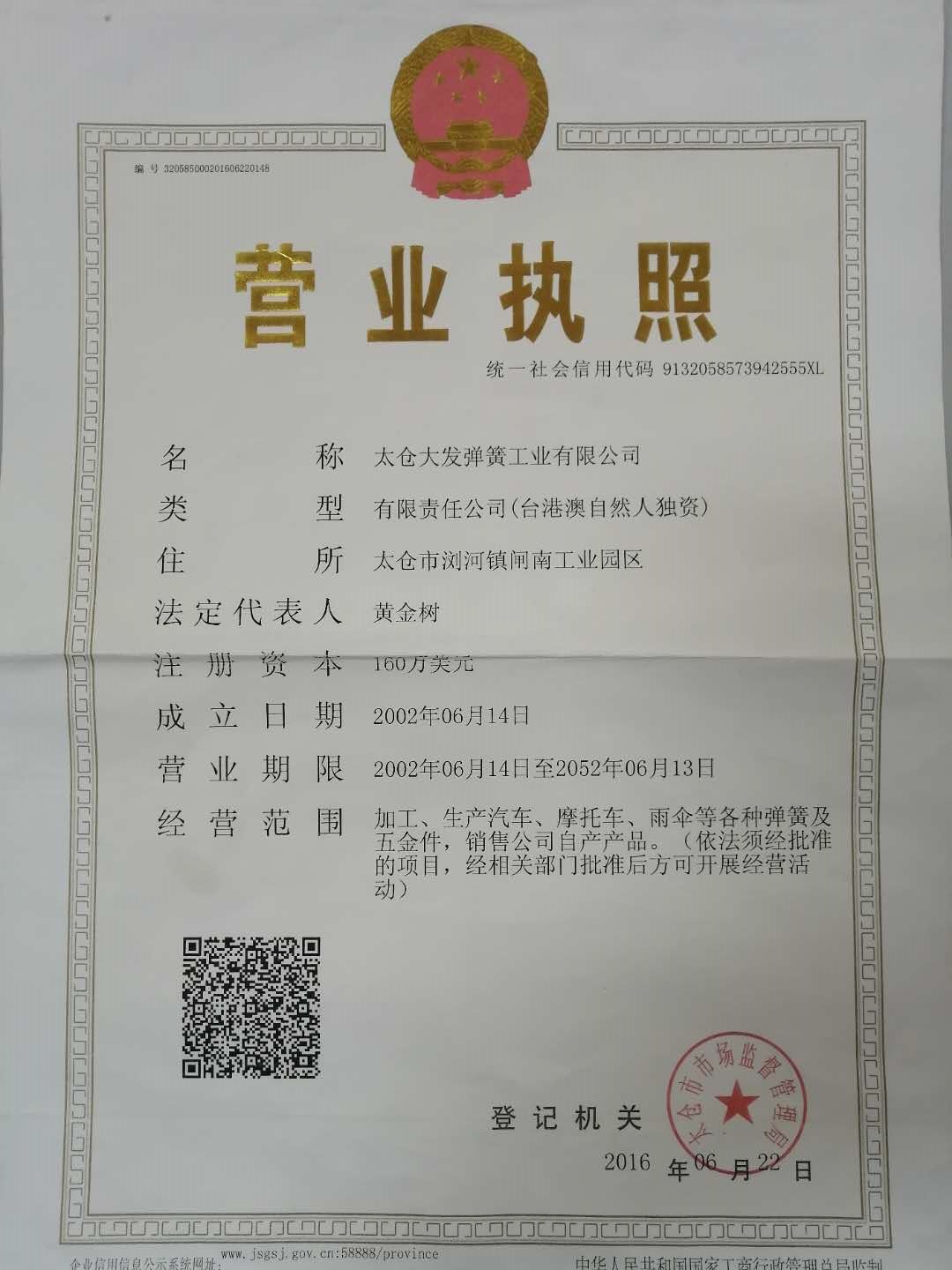 太倉大發(fā)彈簧工業(yè)有限公司由黃金樹先生于1967年始創(chuàng)于臺(tái)灣,是一個(gè)集雨傘、電子、五金機(jī)械、自行車、摩托車、汽車等的彈簧配件生產(chǎn)、加工、輔助設(shè)計(jì)服務(wù)的綜合性企業(yè),其中1990年創(chuàng)辦的廈門大發(fā)彈簧公司、2000年創(chuàng)辦的深圳大發(fā)彈簧公司、2002年創(chuàng)辦的太倉大發(fā)彈簧公司均位于經(jīng)濟(jì)發(fā)展地區(qū),地理位置佳。我們憑借在彈簧制造業(yè)的多年豐富知識(shí)與技術(shù),并著眼于以客戶為導(dǎo)向,秉持“以人為本,以質(zhì)為先,以客為主,持續(xù)創(chuàng)新”的經(jīng)營理念,強(qiáng)化競爭優(yōu)勢(shì)。公司導(dǎo)入ISO9001: 2000質(zhì)量管理體系,執(zhí)行ISO14000:2000管理方式,倡導(dǎo)安全、高質(zhì)量、高素質(zhì)的生產(chǎn)。
